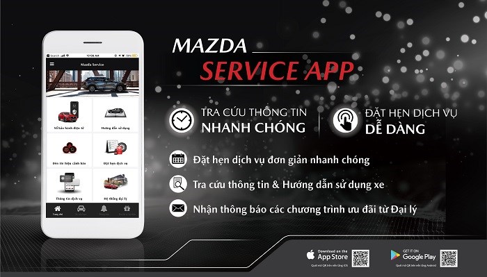 Tải ngay ứng dụng Mazda Service để có thể nắm rõ toàn bộ các tính năng, thao tác trên xe và hưởng thụ các dịch vụ, chính sách ưu đãi một cách nhanh chóng, tiện lợi.